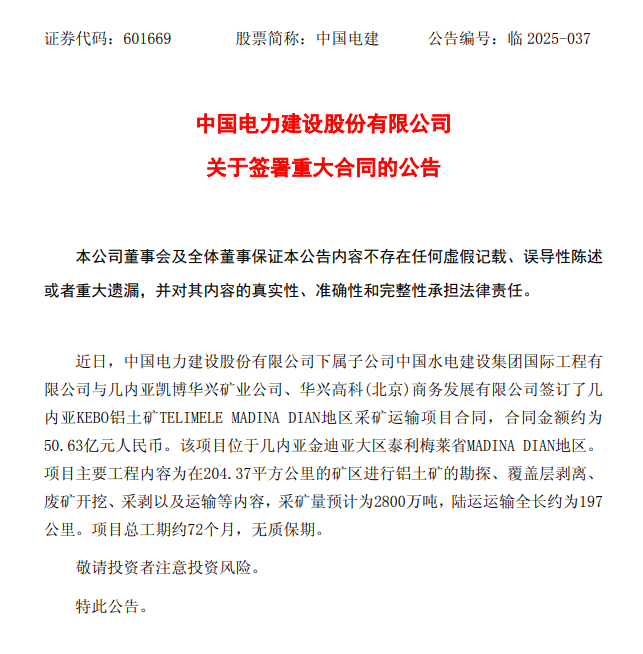 7月3日,中国电建(601669)(601669.SH)公告称,下属子公司中国水电建设集团国际工程有限公司与几内亚凯博华兴矿业公司、华兴高科(北京)商务发展有限公司签订了几内亚KEBO铝土矿TELIMELEMADINADIAN地区采矿运输项目合同,合同金额约为50.63亿元人民币。项目位于几内亚金迪亚大区泰利梅莱省MADINADIAN地区,主要工程内容为在204.37平方公里的矿区进行铝土矿的勘探、覆盖层剥离、废矿开挖、采剥以及运输等内容,采矿量预计为2800万吨,陆运运输全长约为197公里。项目总工期约72个月,无质保期。